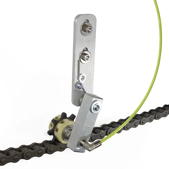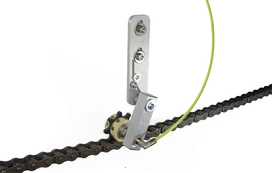 Die Federschwinge für Kettenschmierritzzel erweitert das Einsatzspektrum der Kettenschmierritzel um eine weitere Lösung: Ketten, die schwingen… und das tun viele Ketten, können mit Schmierpinseln, Schmierbürsten oder ähnlichen lösungen ebenfalls nur schlecht geschmiert werden… Sie sind entweder sehr stark beansprucht und verschleißen noch schneller oder Sie berühren die Ketten nicht zu jeder Zeit. Ein Kettenschmierritzel mit Federschwinge hingegen passt sich den Schwingungen der zu schmierenden Kette an und beölt diese so konstant und zuverlässig.